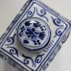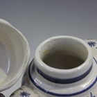 An unusual Dutch Delft tea caddy and cover, 19th century, of shouldered rectangular form, painted to one side with two Masonic emblems opposing a bird perched on a flower, against a ground of stylized flowers and foliage, blue painted 'AG' monogram mark to base, height 12.5cm (cover restored), together with a similar caddy and cover painted with an armorial, height 12cm. Provenance: from the collection of the late Professor Maurice Stacey.