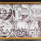 A group of six English Delft tiles, London, 1760-80, each painted in manganese with a biblical scene in a circular panel cornered by foliate motifs, including a depiction of Rehab helping the Spies to escape, each 12.7cm x 12.7cm (faults), held within a wooden frame. Provenance: from the collection of the late Professor Maurice Stacey.