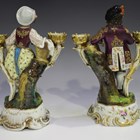 A pair of Jacob Petit porcelain candelabra figures, mid-19th century, modelled as a boy and girl flanked by gilt enriched cornucopia raised sconces, raised on foliate painted mound bases, underglaze blue factory marks, height 20cm (restored).