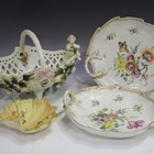 A pair of Dresden single-handled leaf shaped dishes, 20th century, painted with floral sprays, length 25.5cm, together with a Royal Worcester blush ivory shell dish, dated 1896, a Continental porcelain pierced basket and a small figure of a gentleman.