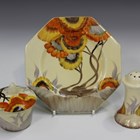 A pair of Clarice Cliff Bizarre Rhodanthe pattern vase, 1930s, of ribbed trumpet shape on circular feet, black printed marks to bases with shape No. 613/8, height 21cm, together with an octagonal side plate, diameter 14.3cm, a pepper and a mustard and cover, all painted in the same pattern.