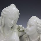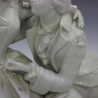 A pair of Meissen porcelain figures, late 19th century, modelled as a recumbent male and female, each holding a flower-filled pierced basket, raised on scroll moulded shaped bases, crossed swords in underglaze blue to bases with incised shape Nos. 2875 and 2874, length 17cm (faults), together with a white glazed Meissen style figure group depicting a romantic couple, crossed swords in underglaze blue to base with incised numerals '1696', length 30cm, raised on a velvet covered base (faults).