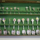 A group of forty-one Elizabeth II silver souvenir spoons, the majority with enamelled terminals, various dates and makers, weight 595.7g, together with six Continental silver souvenir spoons, cased, and two silver napkin rings.