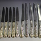 A William IV and later harlequin part canteen of silver Queen's pattern cutlery, comprising six table forks and spoons, nine dessert forks, six dessert spoons, seven teaspoons and a pair of sugar tongs, various dates and makers, including a set of six teaspoons, London 1836 by John James Whiting, weight 2475g, together with six plated matching table knives and six dessert knives.