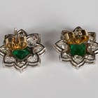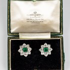 A pair of emerald and diamond nine stone stylized floral cluster earstuds, each mounted with a step cut emerald within a surround of eight cushion cut diamonds, with post and butterfly fittings, total weight 5g, each width 1.6cm, with a case.