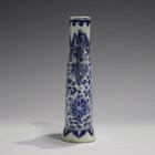 A Chinese blue and white porcelain moonflask, late 19th century, painted with opposing figural panels beneath a pair of chilong handles, height 15.5cm (minor rim chips).