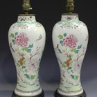 A pair of Chinese famille rose export porcelain vases, Qianlong period, each of baluster form, painted with birds, rocks and peony, height 29.8cm (each drilled to base and converted to a table lamp, glaze fritting and one with hairline crack to body).