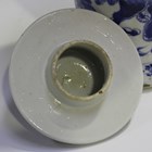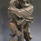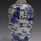 A Chinese blue and white porcelain vase and cover, mark of Kangxi but late 19th century, of baluster form, painted with Buddhistic lions, underglaze blue four-character mark to base, height 38.3cm, together with a Chinese crackle glazed porcelain vase, late 19th century, decorated in relief with iron oxide dragons above a wave moulded band, height 30cm (reduced neck), and a Chinese carved hardwood figure of Li Tieguai, early 20th century, height 38.8cm.