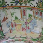 A Chinese Canton famille rose porcelain punch bowl, late 19th century, typically painted with panels of figures, birds and flowers, diameter 37cm (cracked), with a wood stand.
