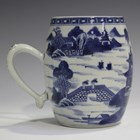 A Chinese blue and white export porcelain tankard, late Qianlong/Jiaqing period, of barrel form, painted with figures and pavilions in a coastal landscape, height 13cm.