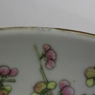 A pair of Chinese famille rose enamelled blue ground porcelain footed dishes, mark of Jiaqing but late Qing dynasty, each enamelled with a central shou medallion within a surround of lotus, bats, pendants and scrolling tendrils within a keyfret rim, iron red enamelled pseudo seal mark to base, width 22.5cm, together with a pair of Chinese famille rose saucer dishes, mark of Daoguang but later Qing dynasty, each painted with prunus, peony, chrysanthemum and lotus, iron red pseudo seal mark to base, diameter 19cm.