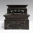 A Chinese hardwood three-tier stand, late Qing dynasty, of rectangular form, the raised central section with square panelled top, flanked by two lower tiers, the frieze carved and pierced to back and front with a bat supporting a pendant, lotus and scrolls, height 13.7cm, length 49cm.