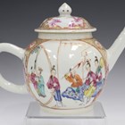 A Chinese famille rose export porcelain teapot and cover, Qianlong period, the globular body painted with opposing figural panels against a gilt ground, height 13cm (cover repaired, chips), together with a Japanese Imari circular charger, Meiji period, diameter 30.5cm (haircrack).