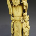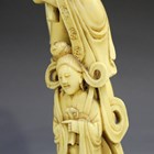 Two Chinese marine ivory carvings, late Qing dynasty, one carved and pierced with a maiden and child, each modelled holding a ruyi sceptre, height 21cm, the other with stained decoration, modelled as an immortal holding a leaf fan above his head, height 17cm.