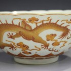 A Chinese iron red decorated porcelain circular bowl, mark of Qianlong but later, the exterior painted and gilt with a pair of confronting dragons and a flaming pearl, underglaze blue pseudo seal mark to base, height 7.6cm, diameter 17.6cm.