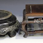 A collection of eight Chinese hardwood stands, mostly late 19th century, comprising a rectangular stand, inset with a grey marble panel, on cabriole legs, length 32.5cm (marble cracked), a square stand with panelled top, pierced apron and cabriole legs, height 10.5cm, a rectangular stand with panelled top, length 34.2cm, and five circular stands of various designs, diameters ranging from 15.8cm to 25cm (some faults).