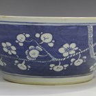 A Chinese blue and white porcelain circular dish, late 19th century, painted with a central panel of precious vessels and flowers within a prunus border, diameter 34.3cm, together with a similar Chinese blue and white bowl, painted with blossoming prunus branches, diameter 27.5cm.