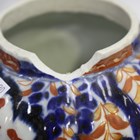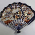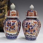 A group of Japanese Imari porcelain, Meiji period, comprising a pair of ovoid jars and domed covers, height 23cm, a fan shaped dish, length 28.2cm, a lobed dish, diameter 31.8cm, and a smaller dish, diameter 21.8cm, together with a collection of other Oriental pottery and works of art, including two Kutani vases, a pair of Chinese soapstone Buddhistic lions and a Japanese lacquer box (some faults).
