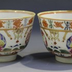 A pair of Chinese famille rose porcelain teabowls, late Qing dynasty, decorated for the Thai market with bands of bodhisattvas and Buddhistic emblems, red enamelled mark to bases, height 5.9cm, diameter 8.5cm (one with hairline crack to rim).