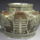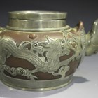 A Chinese pewter mounted Yixing stoneware four-piece tea set, early 20th century, comprising teapot and cover, water pot and cover, sugar bowl and cover and milk jug and cover, each overlaid with pierced and engraved dragon mounts, impressed marks and applied paper label, inscribed 'Hsin Hor Chung (from Hor Chung)... The Only Reliable Maker of these Teapots in the District', height of teapot 10cm.