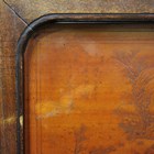 A Chinese softwood and lacquered pine screen, probably late Qing dynasty/early 20th century, the stained softwood frame enclosing seven lacquered panels, incised with figures, birds, animals and landscapes, each with incised text, on outswept feet, height 106cm, width 95.5cm.