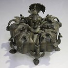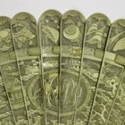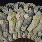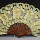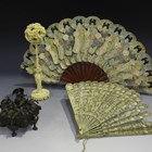 A Chinese Canton export ivory brisé fan, early to mid-19th century, the guards carved in relief with figures and trees, the eighteen sticks carved and pierced in low relief with a central monogram within a border of figures, pavilions and shells, length 18.4cm (faults), together with a Canton export ivory puzzle ball and stand, total height 21.5cm, a Japanese bamboo and paper fan, decorated with figures of maidens, length 22.5cm, and an Indian brass kumkum spice box.