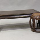 A Chinese hardwood stand/garden seat, 20th century, of openwork barrel form, height 41.5cm, together with a Chinese hardwood coffee table, 20th century, with rectangular top on cabriole legs, length 112cm.