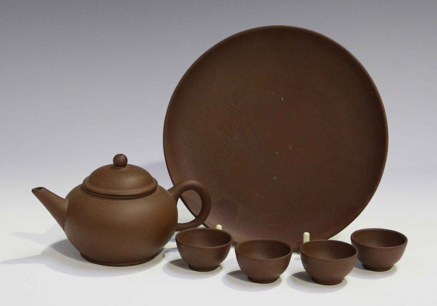 A Chinese Yixing stoneware miniature tea set, 20th century, comprising a teapot and cover of squat circular form, four cups and a circular tray, impressed seal mark to base of teapot, height of teapot 6.5cm.