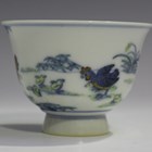 A Chinese doucai porcelain footed cup, mark of Yongzheng but modern, the exterior painted with a cockerel, chicken, rocks and bamboo, underglaze blue six-character mark to base, height 6cm.