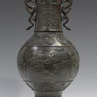A Japanese brown patinated bronze vase, Meiji period, the globular body cast with landscape panels beneath a flared neck with dragon handles, on a circular base, unmarked, height 51cm.