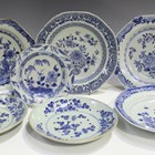 A collection of Chinese blue and white export porcelain dishes, 18th century, including a pair of circular dishes, painted with fruiting branches, underglaze blue pseudo seal mark to bases, diameter 19.5cm, four octagonal dishes and two smaller dishes, together with a famille rose export porcelain punch bowl, Qianlong period, painted with panels of flowers, diameter 26cm.