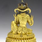 A Chinese gilt bronze figure of a bodhisattva, mark of Yongle but probably 20th century, modelled in a seated pose with hands held in namaskara mudra, wearing a headdress, celestial scarf and bead jewellery, on a double lotus throne, incised six-character mark to upper surface of lotus pedestal, the base engraved with a visvavajra, height 27.3cm.