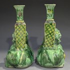 A pair of Chinese famille verte enamelled biscuit porcelain Buddhistic lion spill vases, Kangxi period, each recumbent beast modelled with front paw resting on a brocade ball, each supporting a square tapering vase to its back, height 17.5cm (one with minor restoration to rim, the other with section of back broken). Note: this lot is accompanied by an original purchase invoice and insurance valuation, dated 1st March 1966 and November 1965, from W. Waddingham Antiques & Works of Art of 10 Royal Parade, Harrogate.