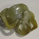 A Chinese jade snuff bottle, late Qing dynasty, of hu form, carved in low relief with a pair of lion mask handles, height 5.7cm, together with a Chinese jadeite snuff bottle, 20th century, carved and pierced with a gourd, leaf and tendrils, the stone of pale celadon tone with russet inclusions, length 4.5cm (lacking stoppers).