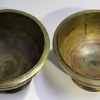 A pair of Indian brass circular bowls, 18th/19th century, each exterior engraved with foliate bands on a spreading foot, height 10cm, together with a polished bronze bowl with girdle and spreading foot, height 10cm.