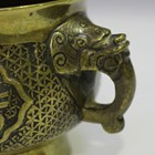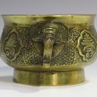 A Chinese polished bronze censer, late Qing dynasty, the bombé circular body cast with six character medallions between Buddhistic lion mask and tongue handles, weight 494g, height 7.5cm, width across handles 15cm (minor repair).