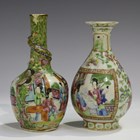 A pair of Chinese Canton famille rose enamelled celadon ground porcelain dessert dishes, mid-19th century, each painted with butterflies, flowers and birds, length 26.3cm (chip to rim of one), together with a collection of other Canton famille rose porcelain (some faults).