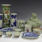 A collection of Chinese porcelain, 18th century and later, including a famille verte cylinder vase, height 30cm, a celadon glazed vase, the body applied with a dragon, height 20.5cm (neck reduced), and a famille rose cylindrical brush pot, height 12cm (faults).
