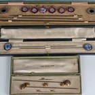 A selection of mainly early 20th century hatpins, including a cased set of 'Patent Arcanus Pins', a cased pair of hatpins with circular blue terminals, a pair of amber effect hatpins, a cased pair of 'Army Service Corps' buttons, a Japanese Satsuma hatpin, a Tunbridge ware hatpin and various other pairs.