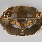 A gold and cabochon green tourmaline brooch of stylized thistle design, detailed '9ct', weight 5.1g, width 3.2cm, with a case.
