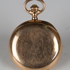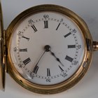 A gold keyless wind half-hunting cased lady's small-size fob watch with unsigned jewelled cylinder movement, the case back interiors detailed '14K 42663', the enamelled dial with black Roman hour numerals and outer Arabic minutes, case diameter 2.7cm, total weight 18.3g.