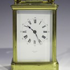 A 20th century French lacquered brass carriage timepiece with eight day movement, the white enamel dial with Roman hour numerals and inscribed 'Henry Capt Geneve', the glazed case with a swing handle, on bracket feet, height 13cm.