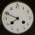 An Edwardian mahogany mantel clock with French eight day movement striking on a gong, the enamel dial with Arabic hours, the arched case with boxwood line inlaid decoration, height 24cm, with pendulum, together with a similar mantel timepiece, height 14.8cm.