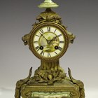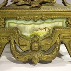 A late 19th century French gilt metal and porcelain mantel clock with eight day movement striking on a bell via an outside countwheel, the dial painted with a landscape within black Roman numeral border, the drum case with urn surmount, on paw feet, height 34.5cm, with pendulum.