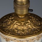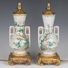 A pair of late 19th century Japanese export porcelain and ormolu mounted table lamps, the twin-handled bodies decorated with flowers, raised on finely cast bases, height 39cm (one handle repaired).