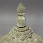 A carved sandstone architectural wall bracket, probably Indian, the demi-lune body carved with vertical reeding and petals, height 47cm, width 54cm, depth 28cm.