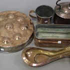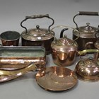 A collection of mainly 19th century copper and brassware, including a George III bell metal candlestick, height 25.5cm, four Victorian copper kettles, an 18th century bell metal tray, diameter 41cm, a copper water scoop and a coal scuttle.