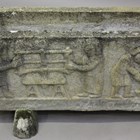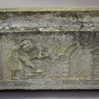 A large 20th century cast composition stone rectangular garden planter, one side moulded with a band of workmen, height 35cm, width 126cm, depth 25cm.
