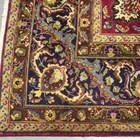 A Mashad carpet, Central Persia, mid-20th century, the claret field with a large floral medallion, supported by scrolling tendrils issuing palmettes and leaves, within a blue complimentary border, bearing signature, 405cm x 300cm.