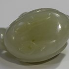A Chinese pale celadon jade water coupe, carved in the form of a duck holding a lingzhi fungus in its beak, height 3.5cm, length 4.5cm.